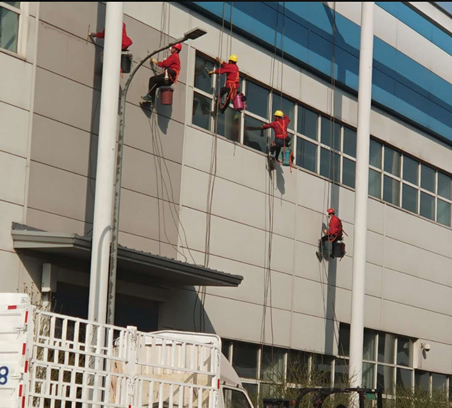 2、吊籃方式:在樓頂架設(shè)吊籃將工人運送到指定位置進(jìn)行施工操作。此施工方式清洗效率較低,成本較高。